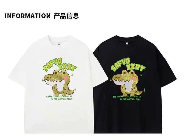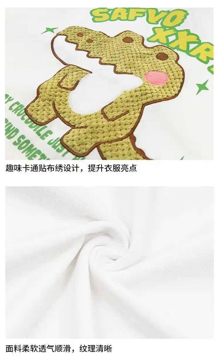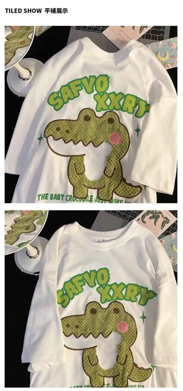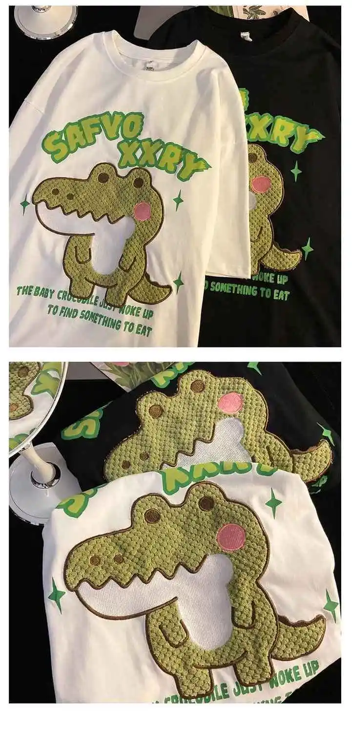 American Cartoon Green Dinosaur Embroidery T Shirts Cute Anime Kawaii Tee for Teenage Streetwear Hip Hop Y2K Top Summer Casual