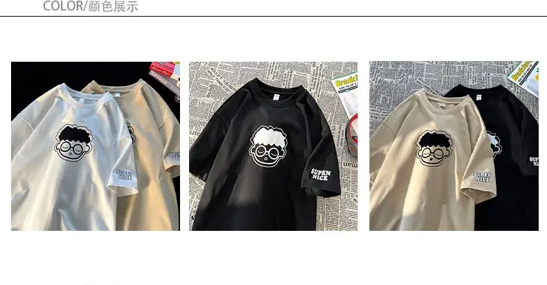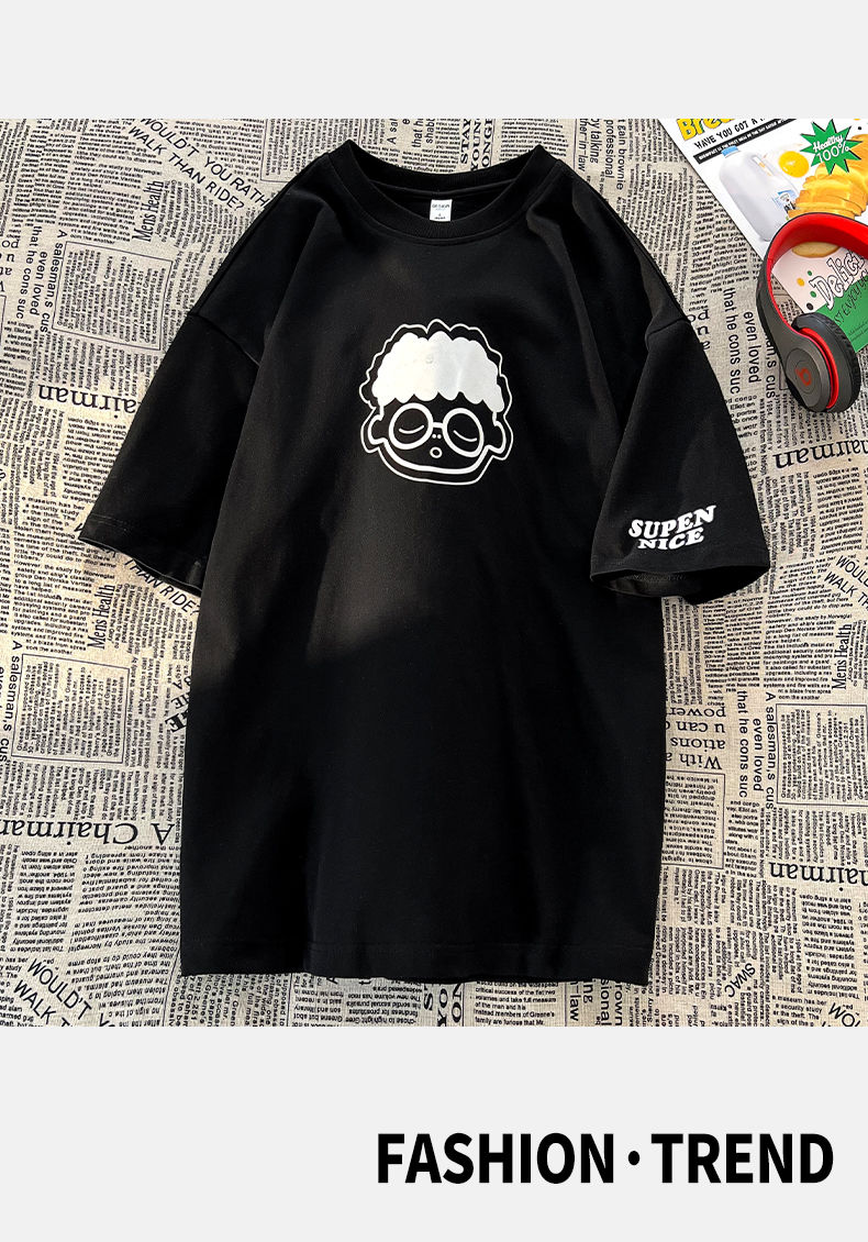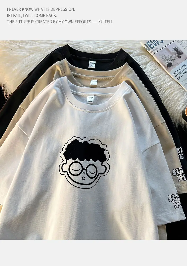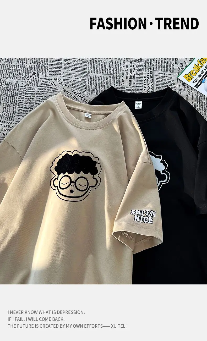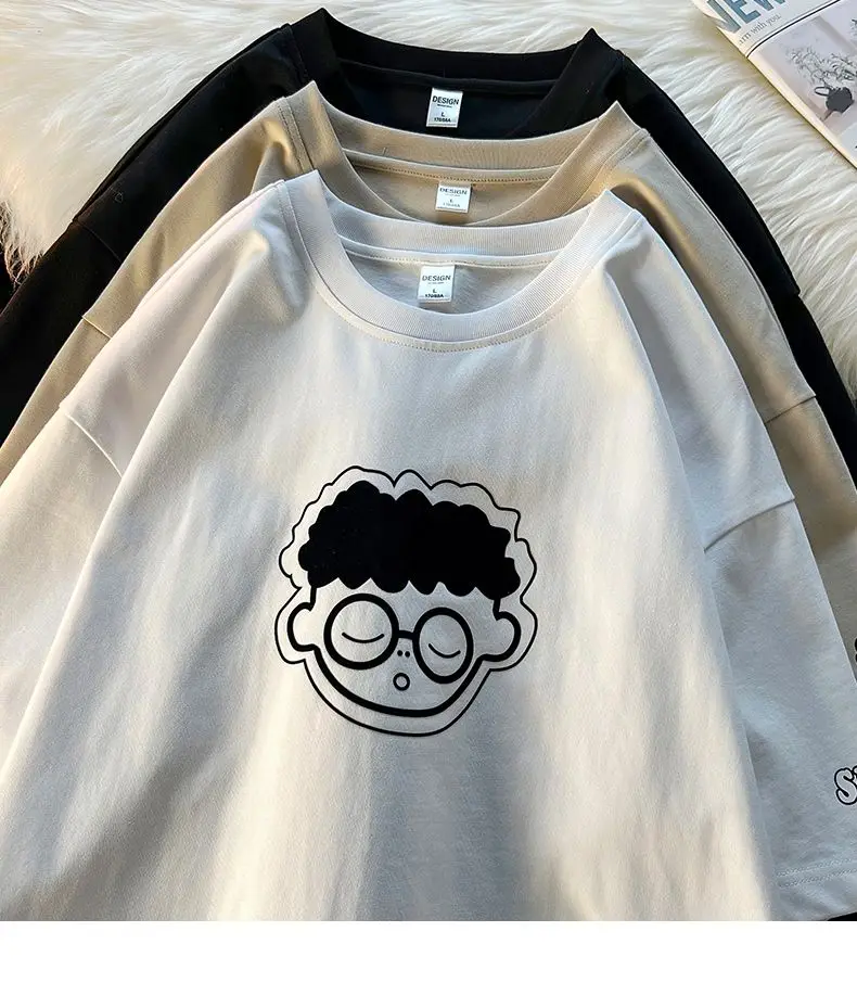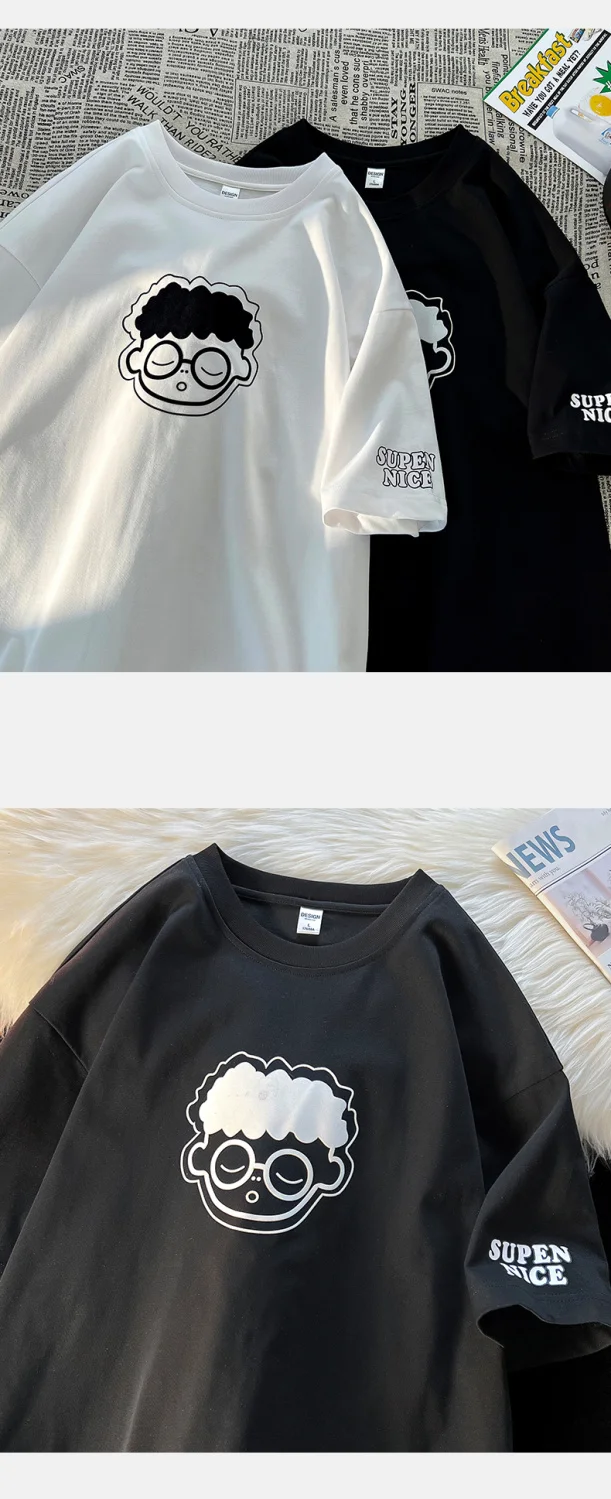 Chic Cartoon Boy Print Solid T Shirts O-neck Loose Summer Tops Teenage Streetwear Fashion Hip Hop Tee High Quality Cotton Casual