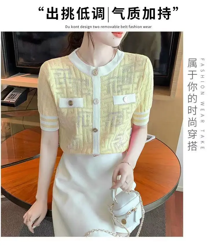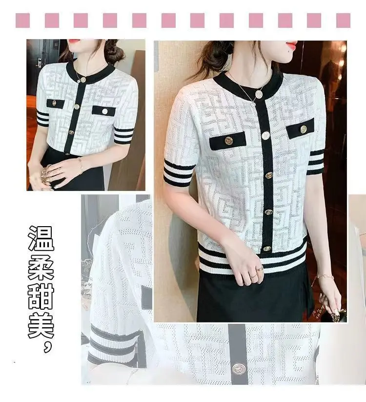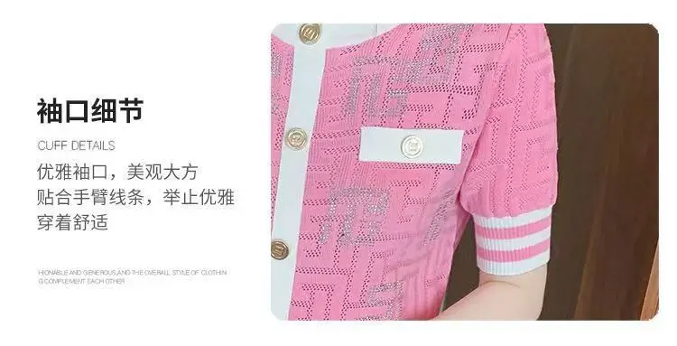 Retro Geometric Jacquard Crystal Diamonds Knitted T Shirts Comfort Summer Ice Silk Elegant Ladies Pink White Tops Korean Fashion