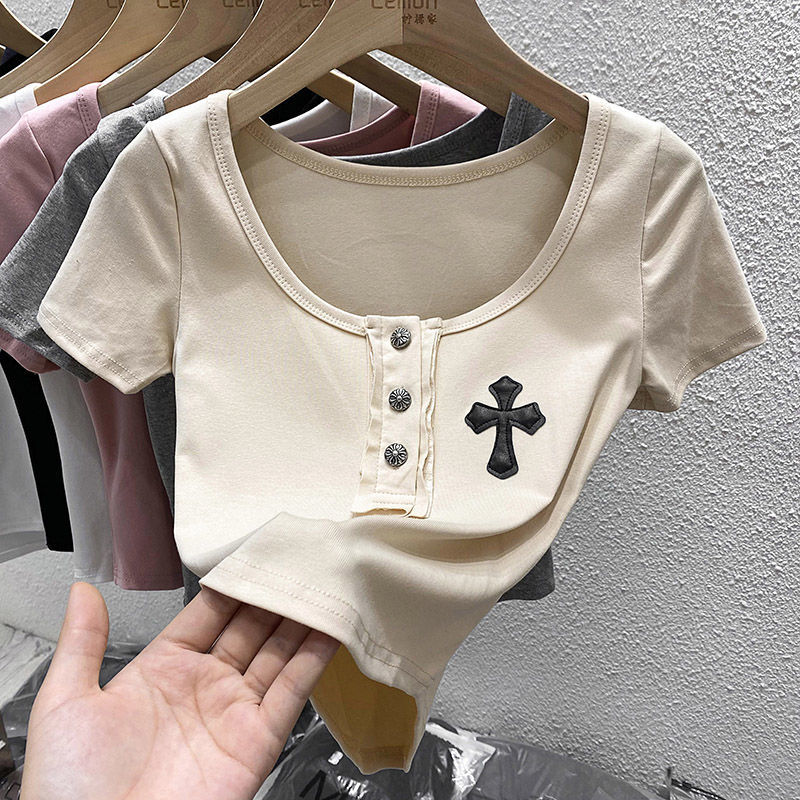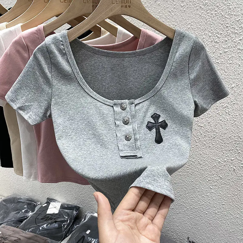 U-neck Square Collar Crop Tops Black Cross Appliques Solid T Shirts Skinny Basic Office Lady Streetwear Summer Casual Korean Ins